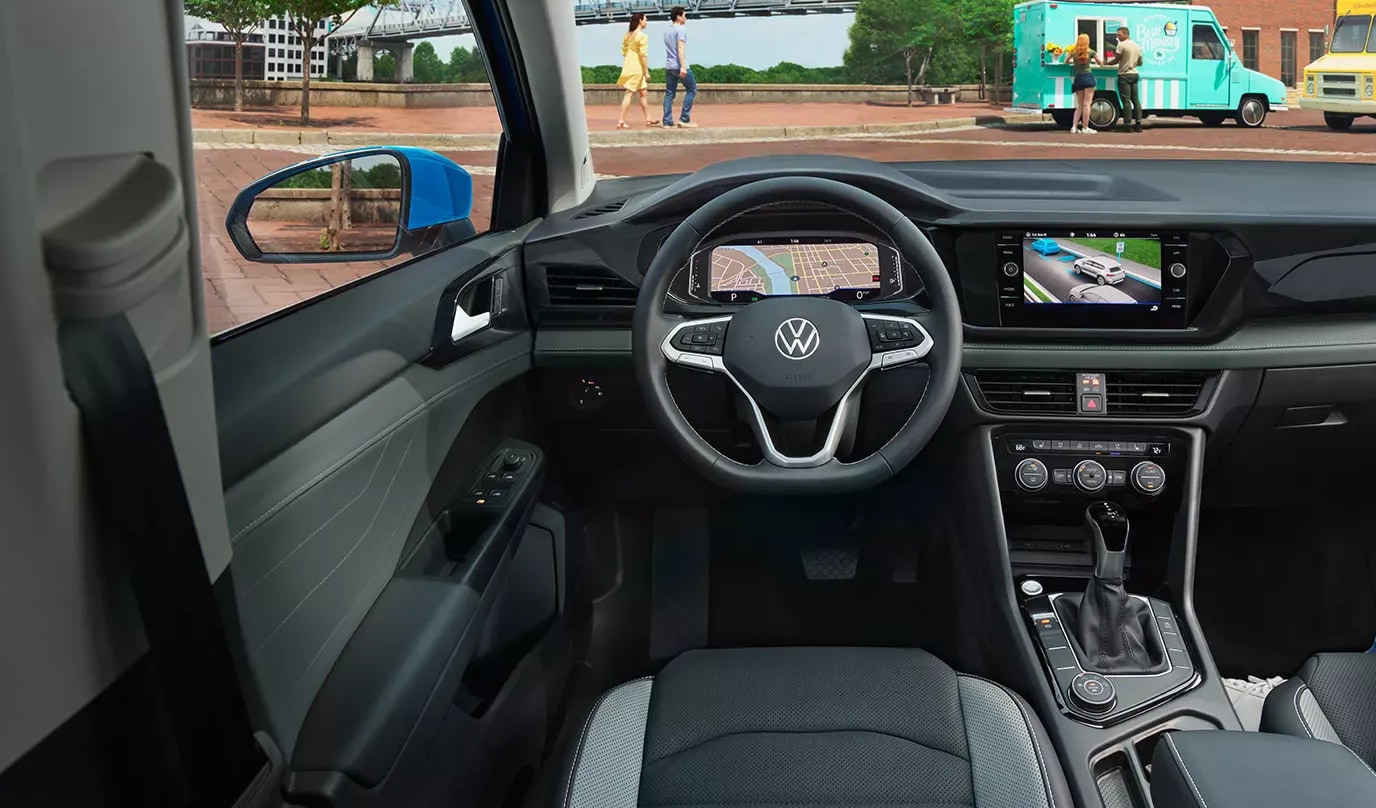 The base Volkswagen Taos S features CloudTex, cloth seating surfaces, a leatherette-wrapped, heated multifunction steering wheel, and a leather-wrapped gear shift knob. The front bucket seats in the Volkswagen Taos S trim are six-way manually adjustable. The interior also features a 60/40 split-folding rear seat with a center armrest. The Volkswagen Taos SE trim adds an eight-way power adjustable driver seat with lumbar and heated front seats.